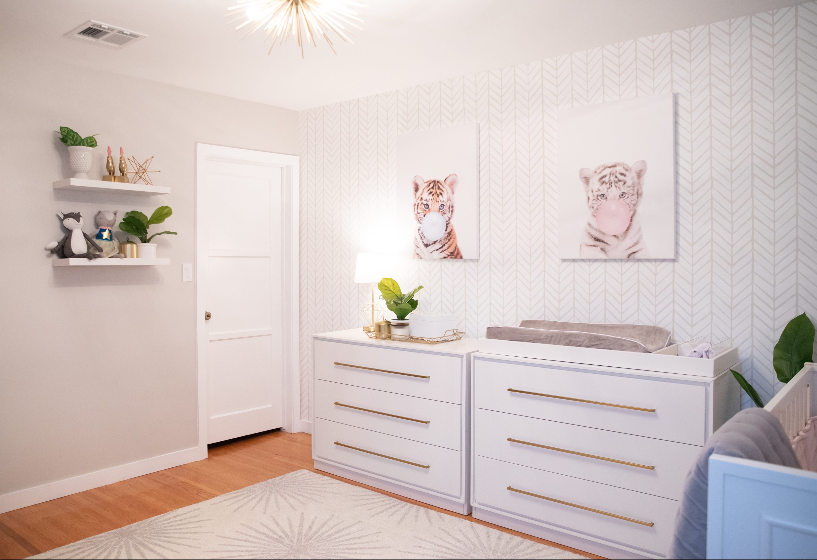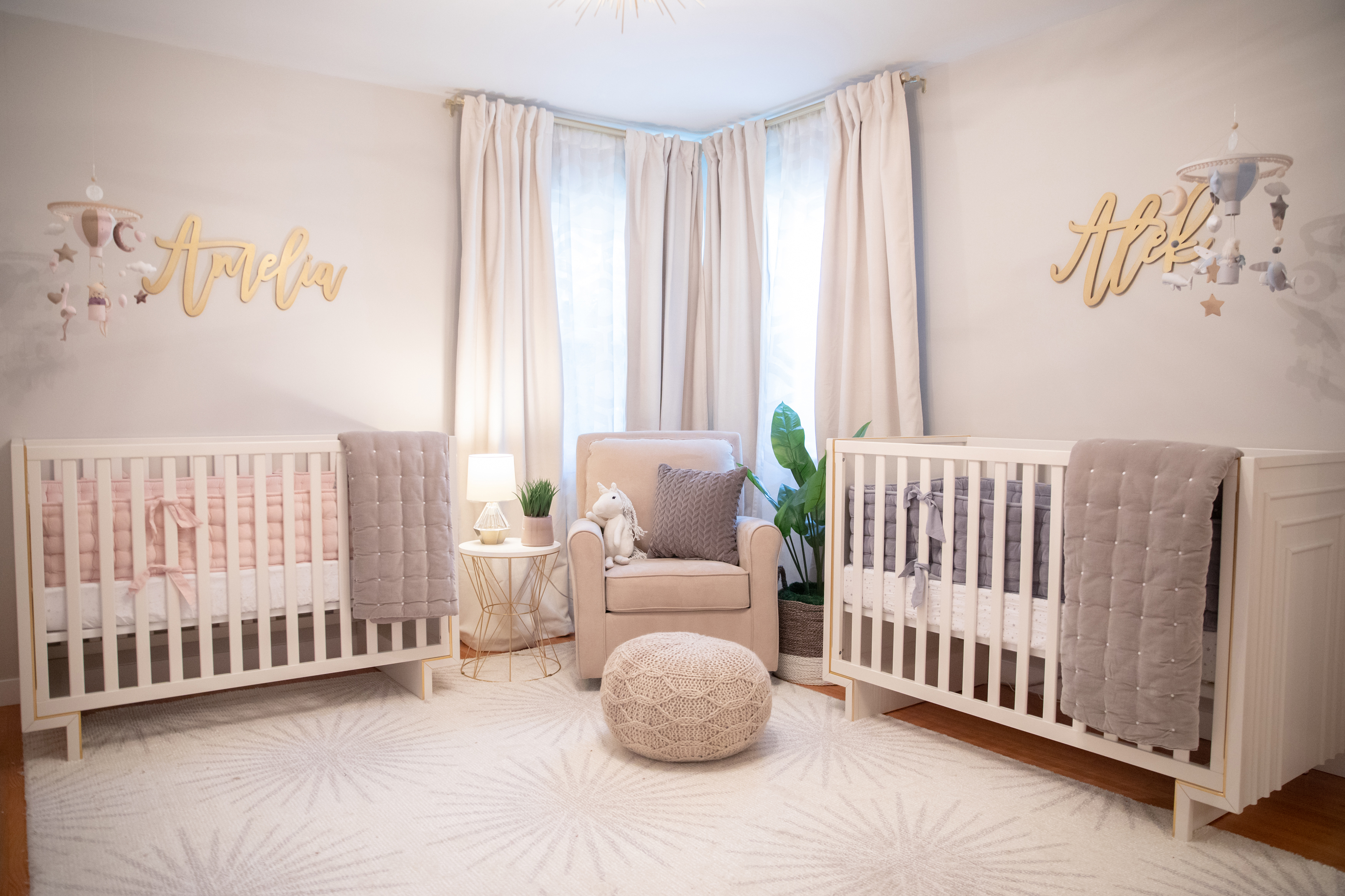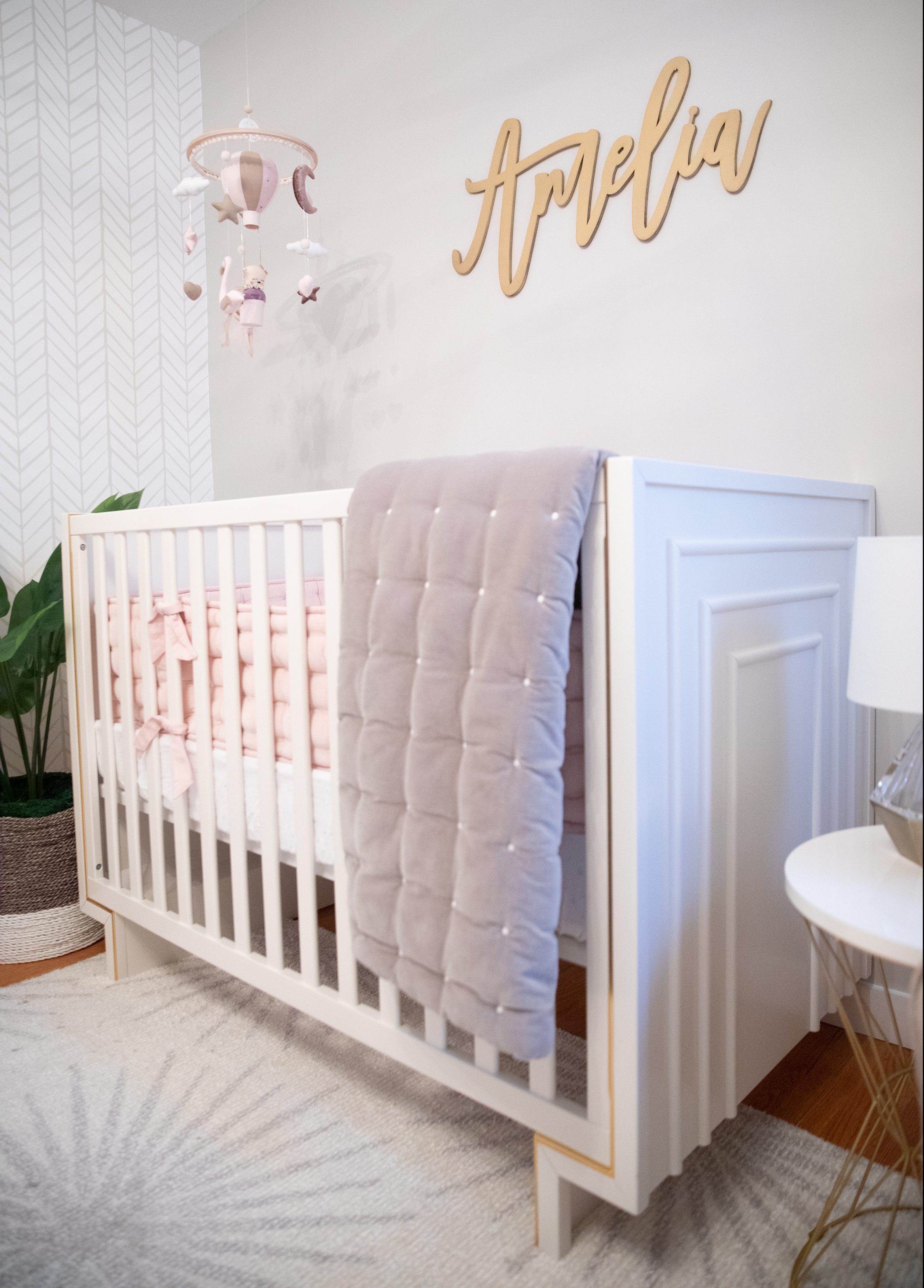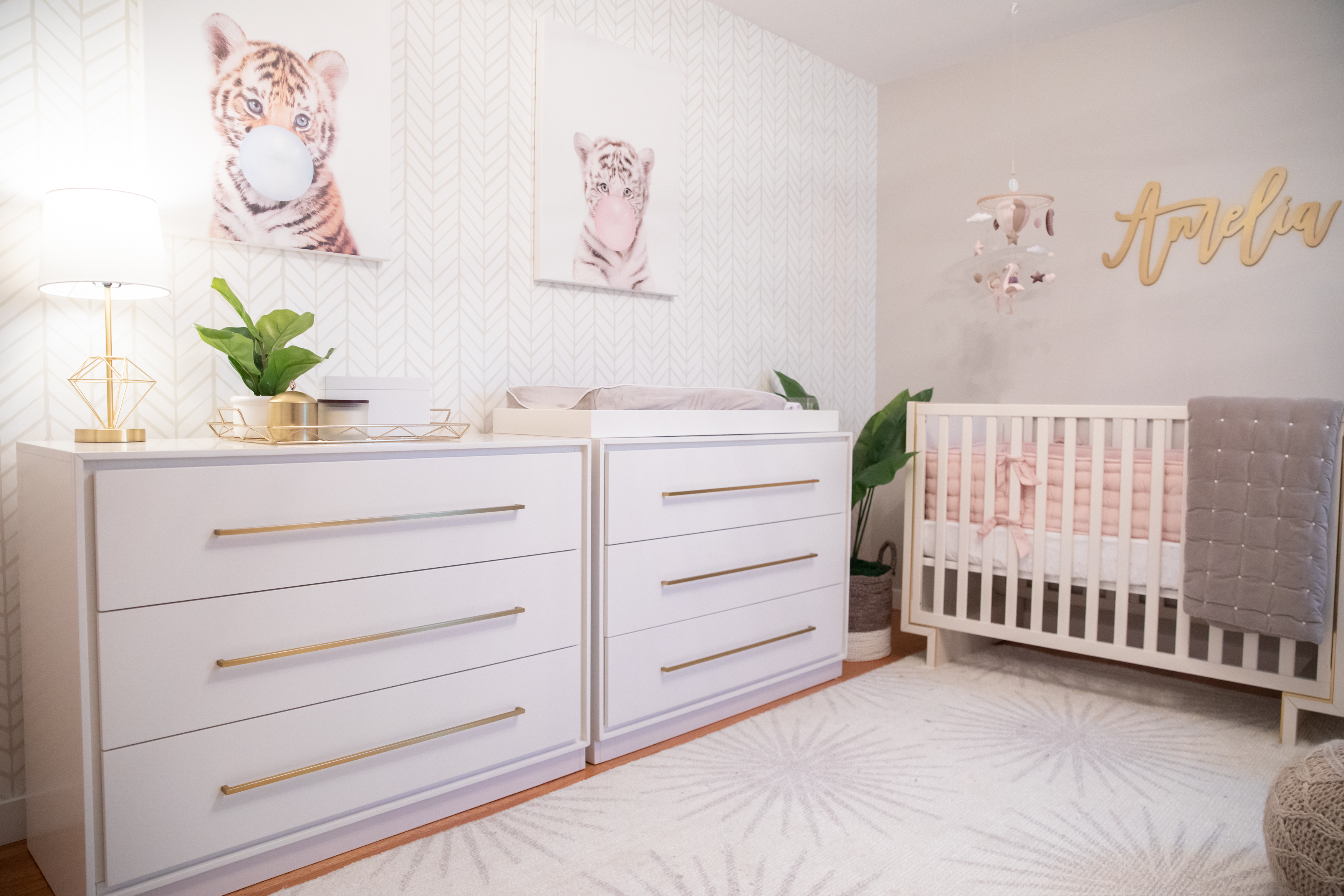 A cohesive gender-neutral room that is accented with pops of pink and blue and tied together with glimmers of gold.