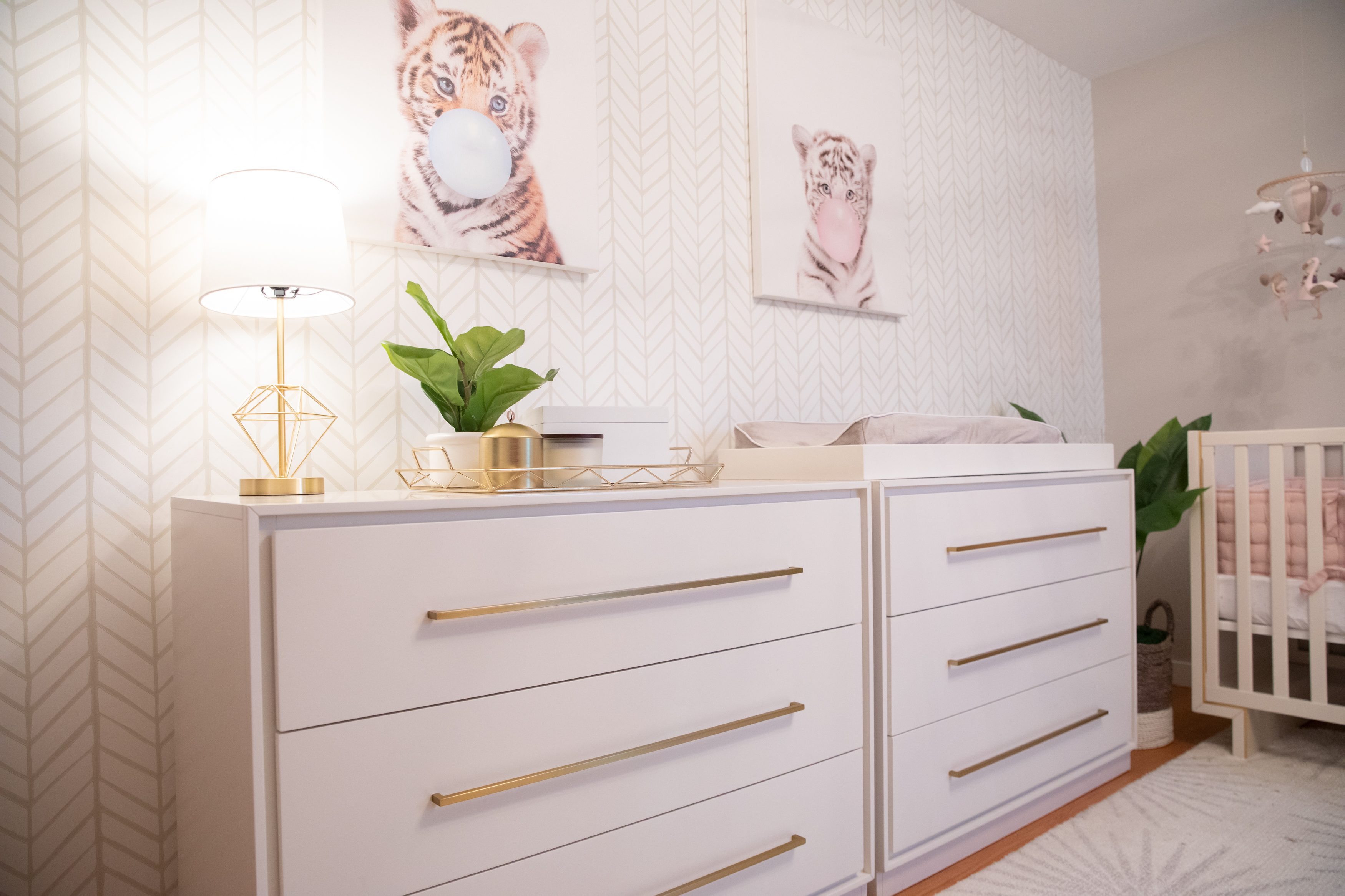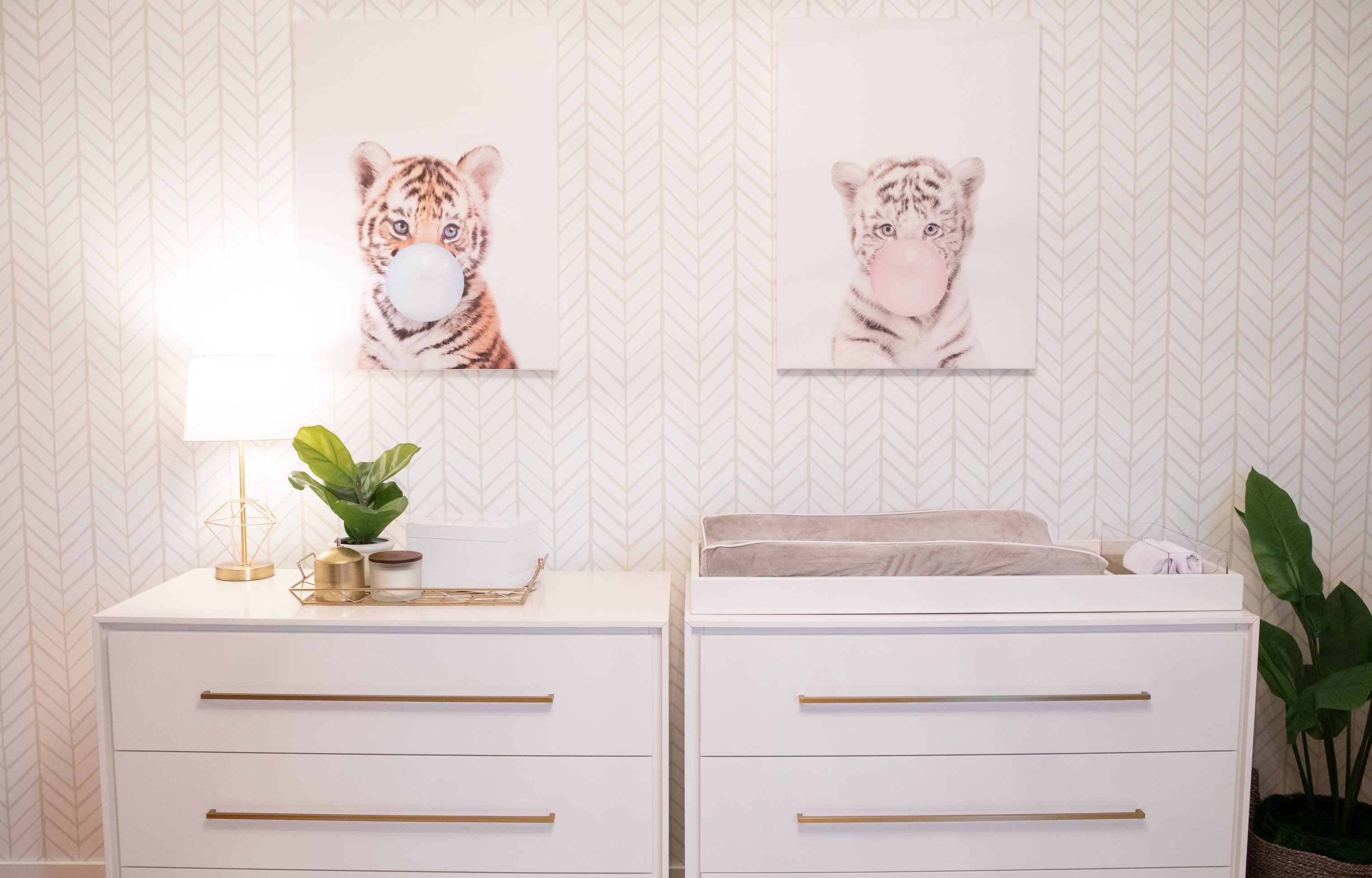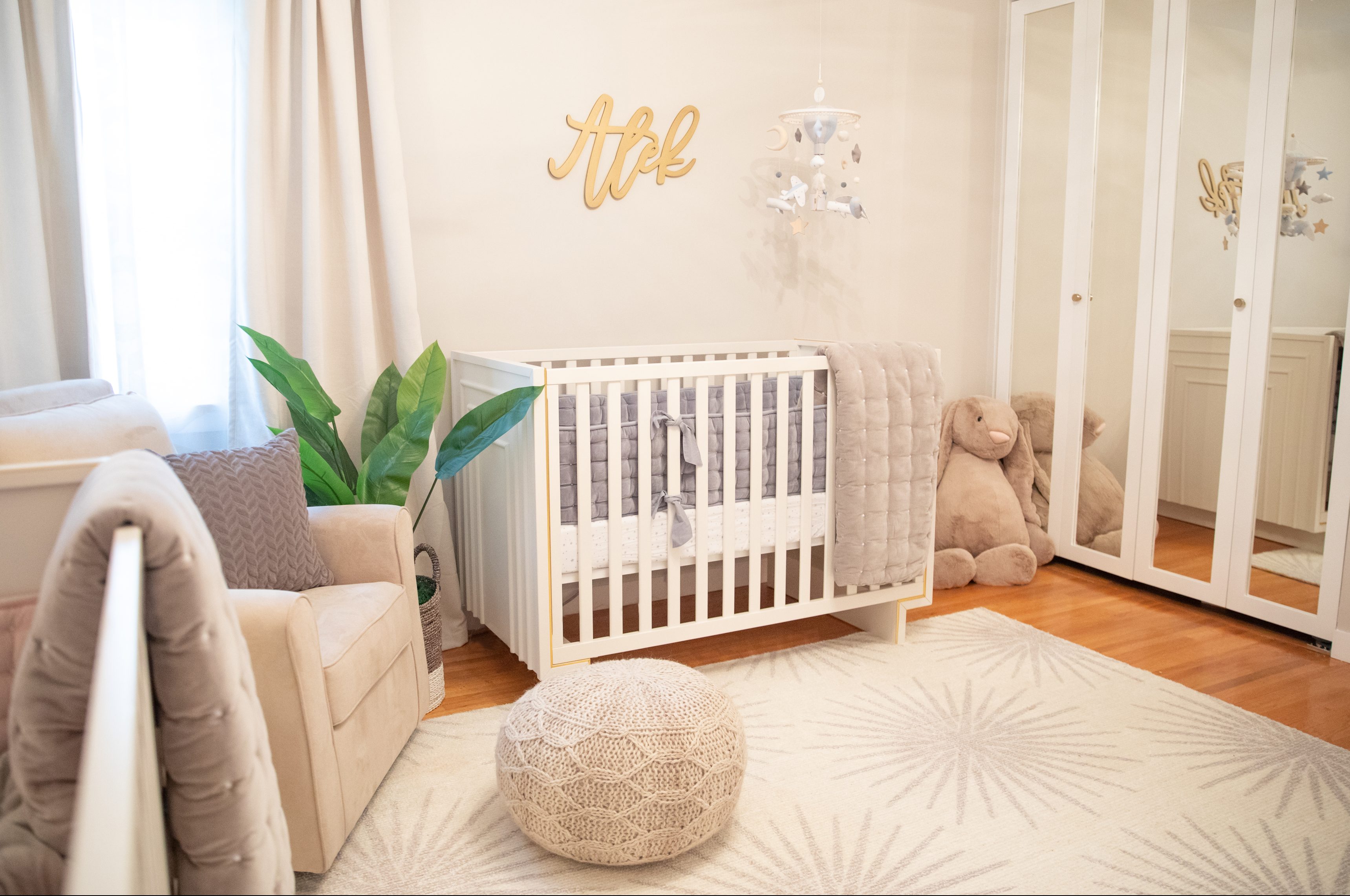 A cohesive gender-neutral room that is accented with pops of pink and blue and tied together with glimmers of gold.