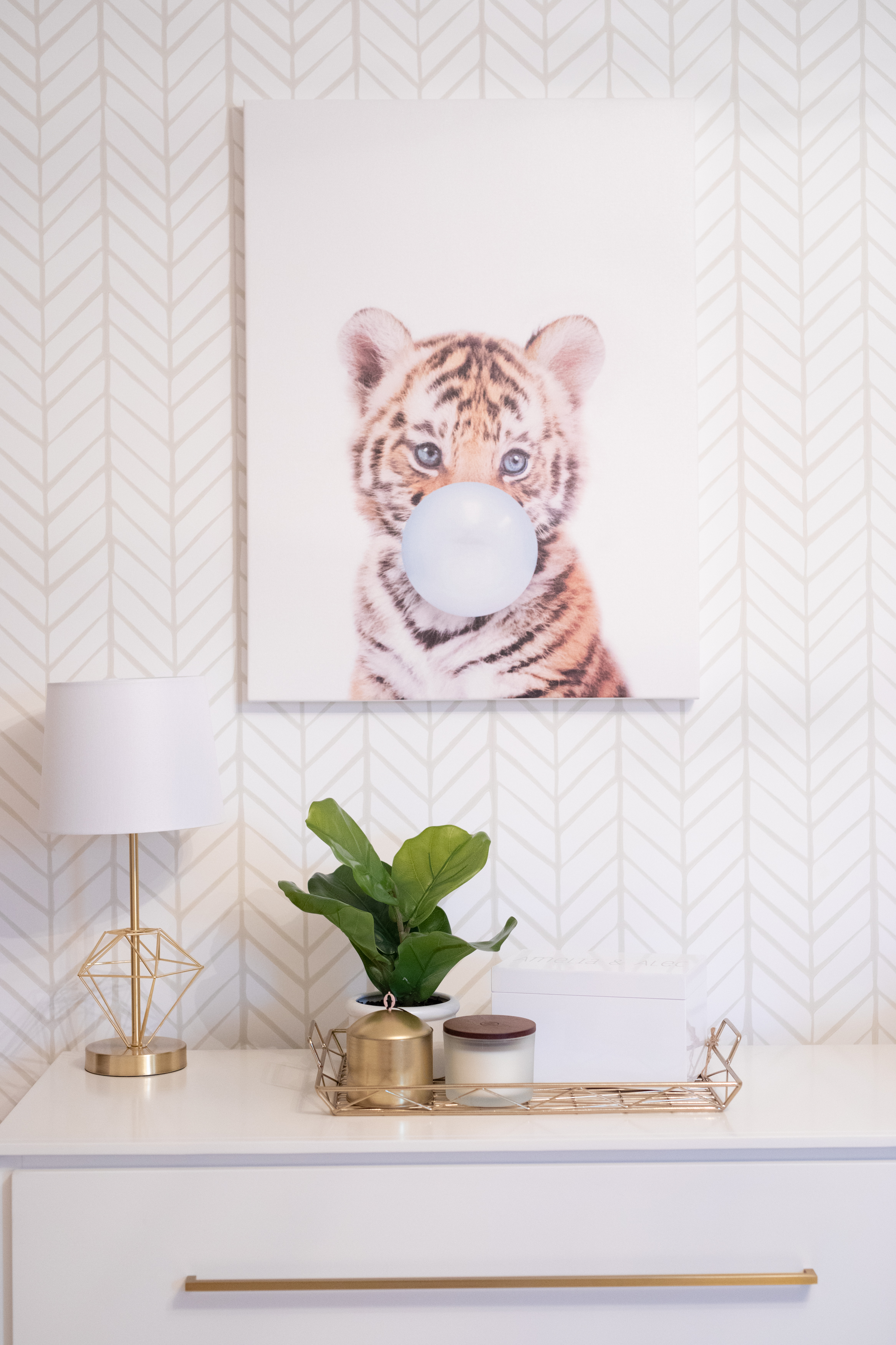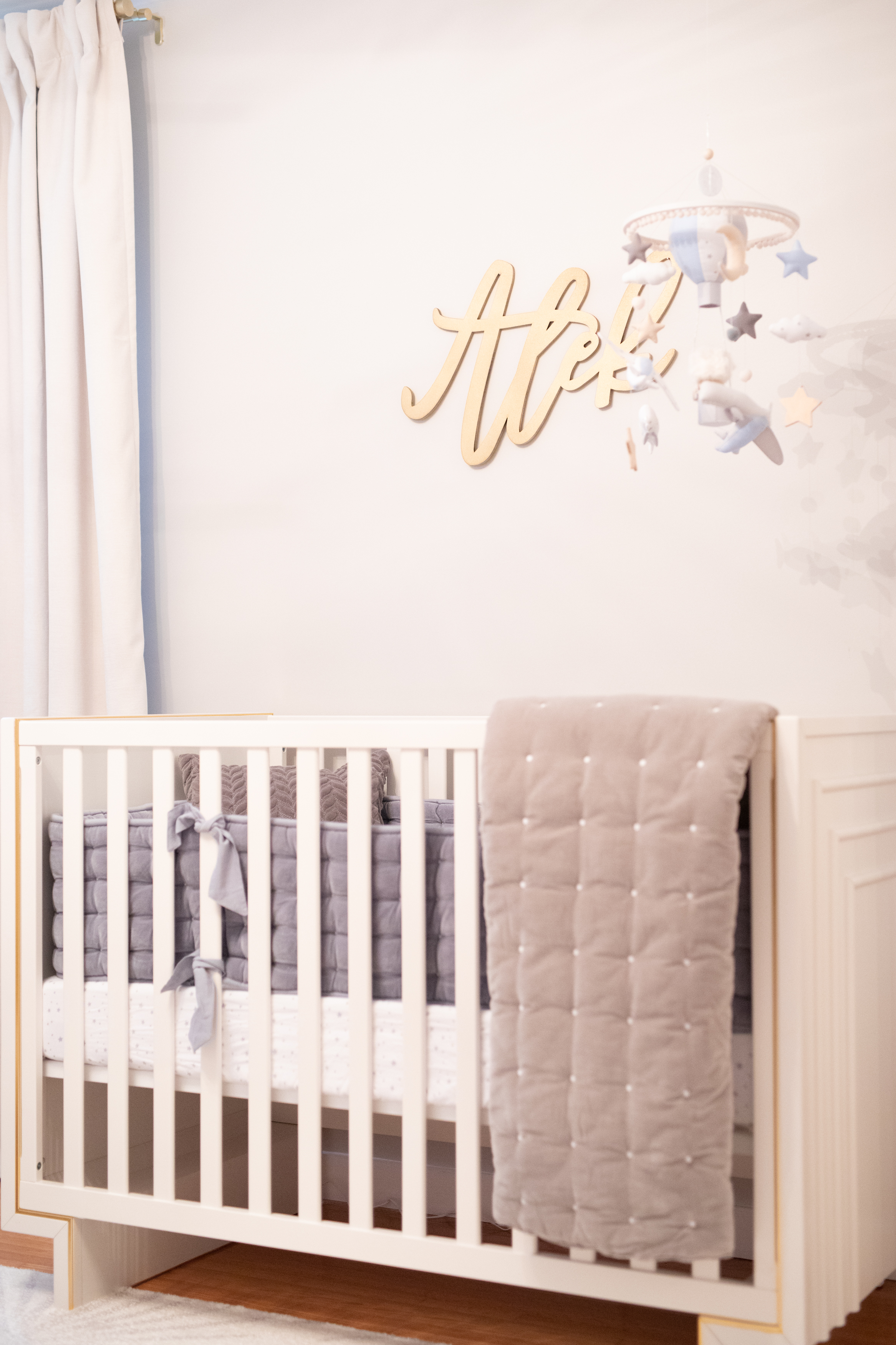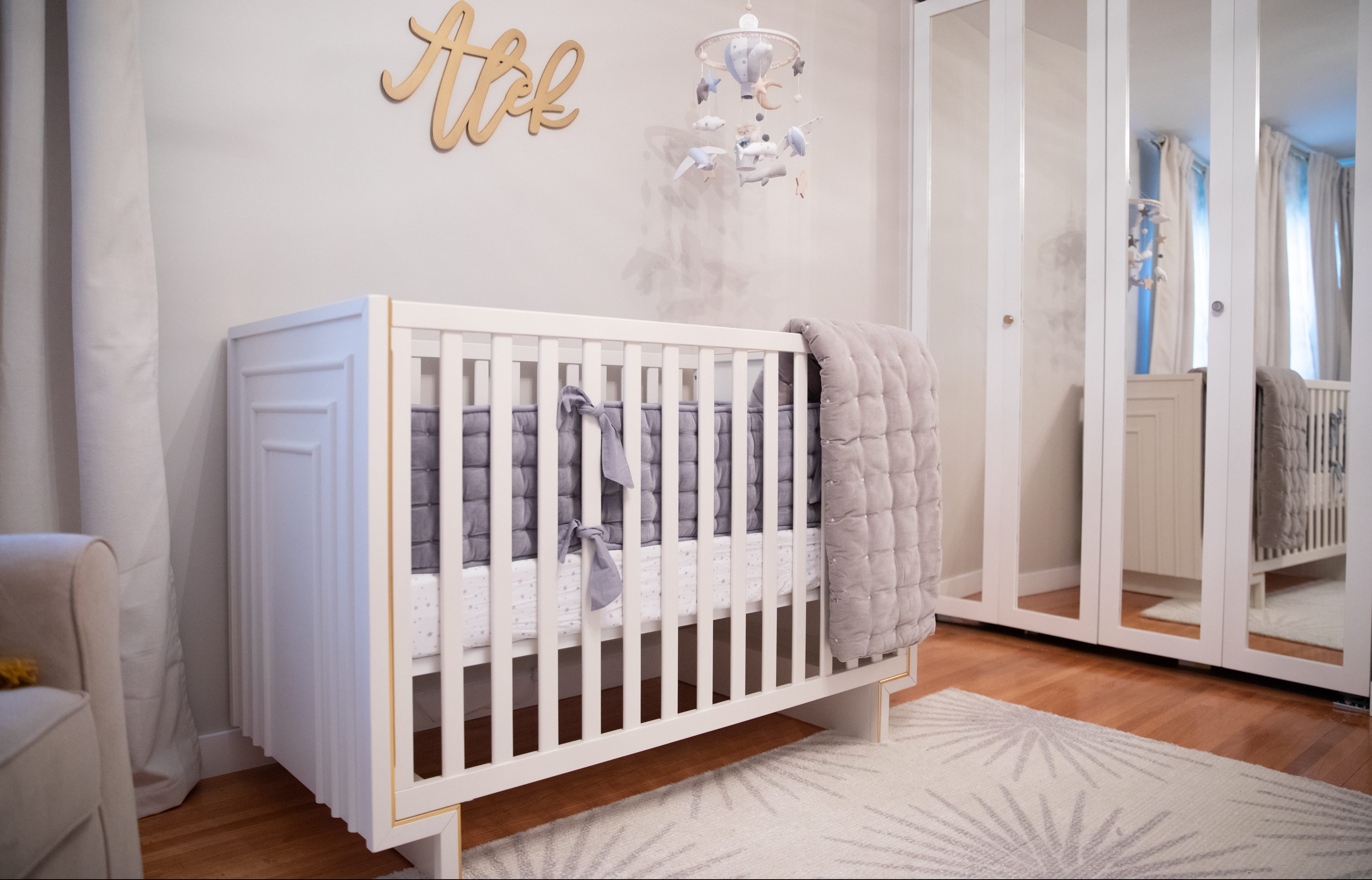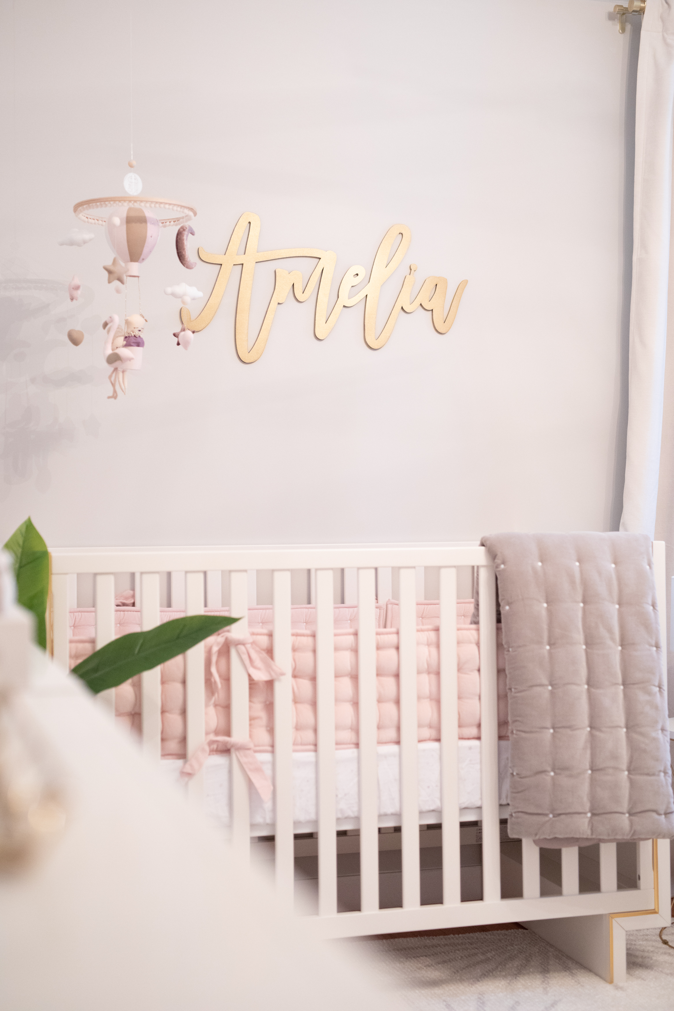 A cohesive gender-neutral room that is accented with pops of pink and blue and tied together with glimmers of gold.